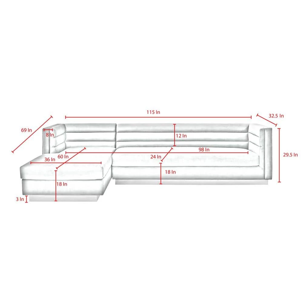 - MODERN GLAM – This stylish chaise.sectional sofa with modern appeal and velvet buttery soft upholstery will make a statement in any room.Horizontal channel tufting, straight lines, square arms will perfectly match with any design theme.