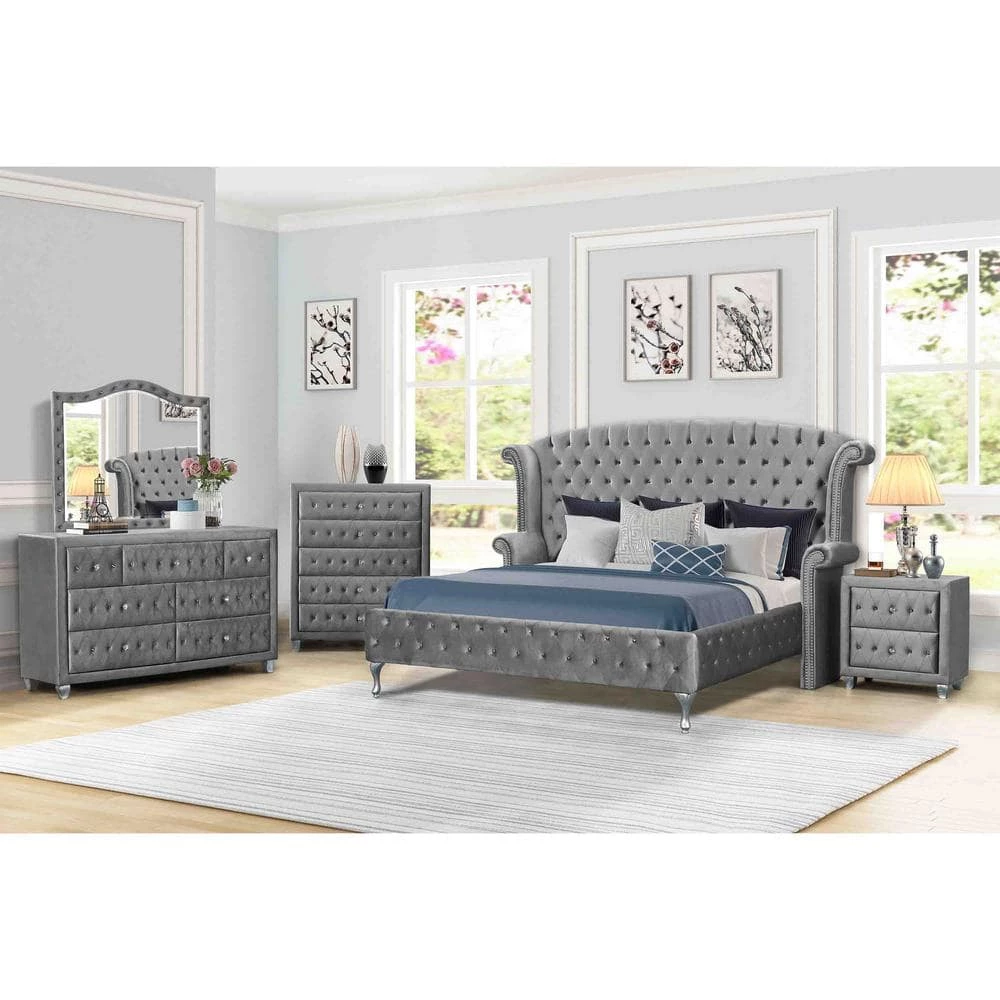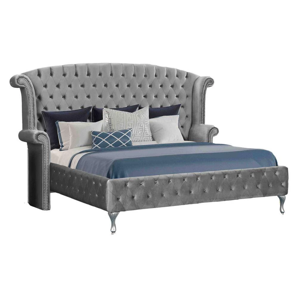 - Grey crushed velvet with a nailhead trim and glimmering crystal-like studs