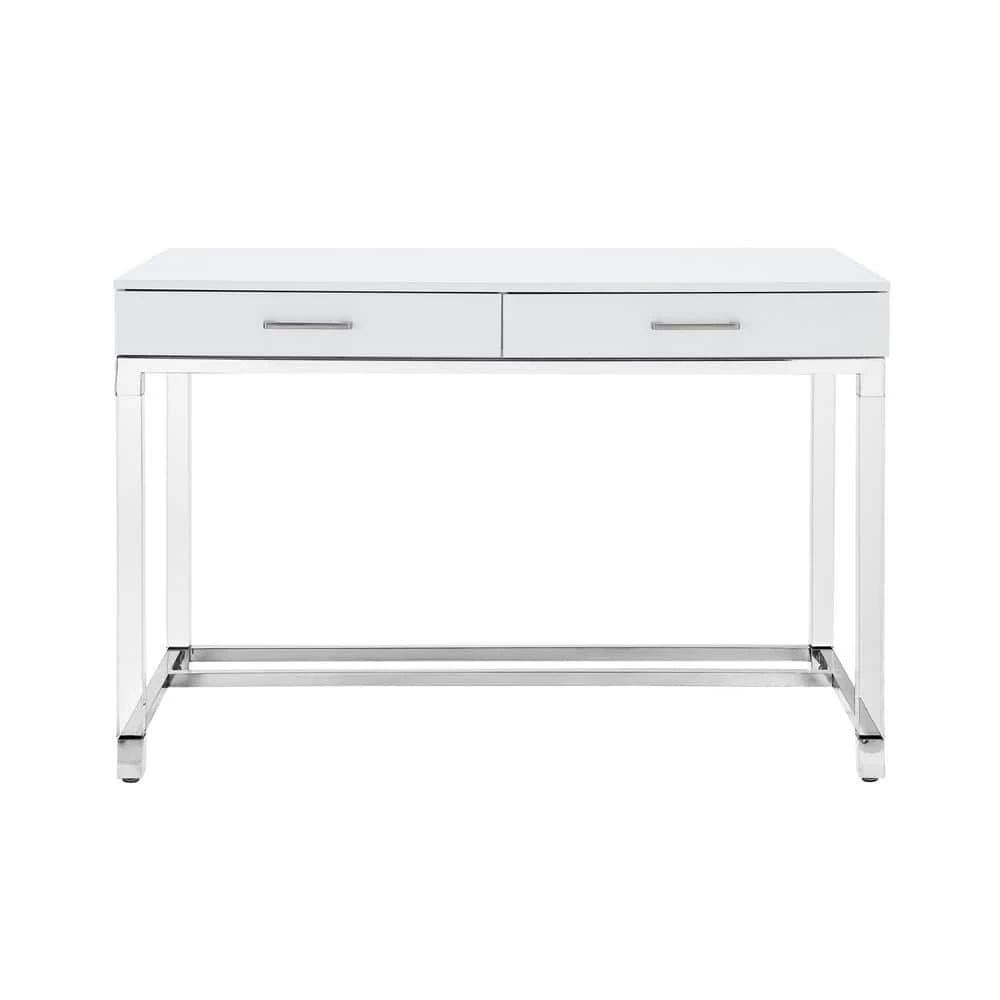 The unusual design of this writing desk/vanity/makeup table/computer desk/console table make it a striking addition to any space, creating shimmering and lustrous appeal. Crafted from durable eco-friendly MDF with in a sleek high gloss finish, acrylic legs, stainless steel polished base frame with matching handles, this elegant 2-drawer piece is an excellent solution for the modern home. Smooth gliding drawers are perfect for organizing living essentials.