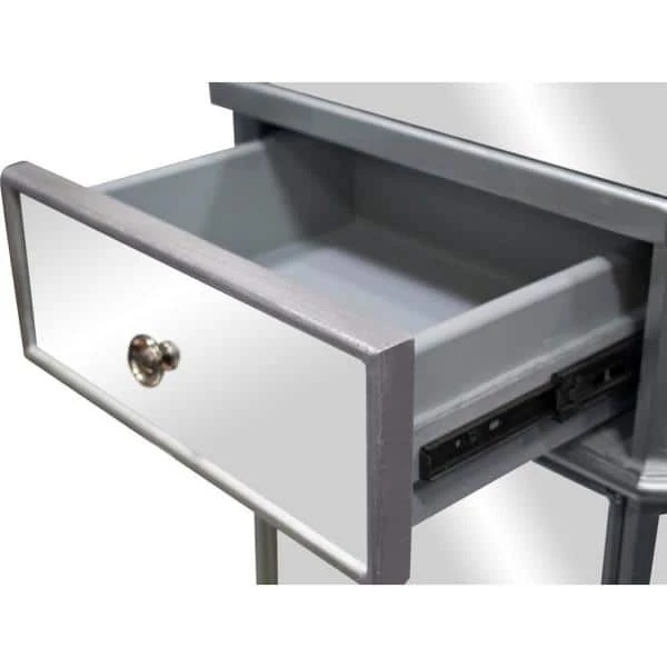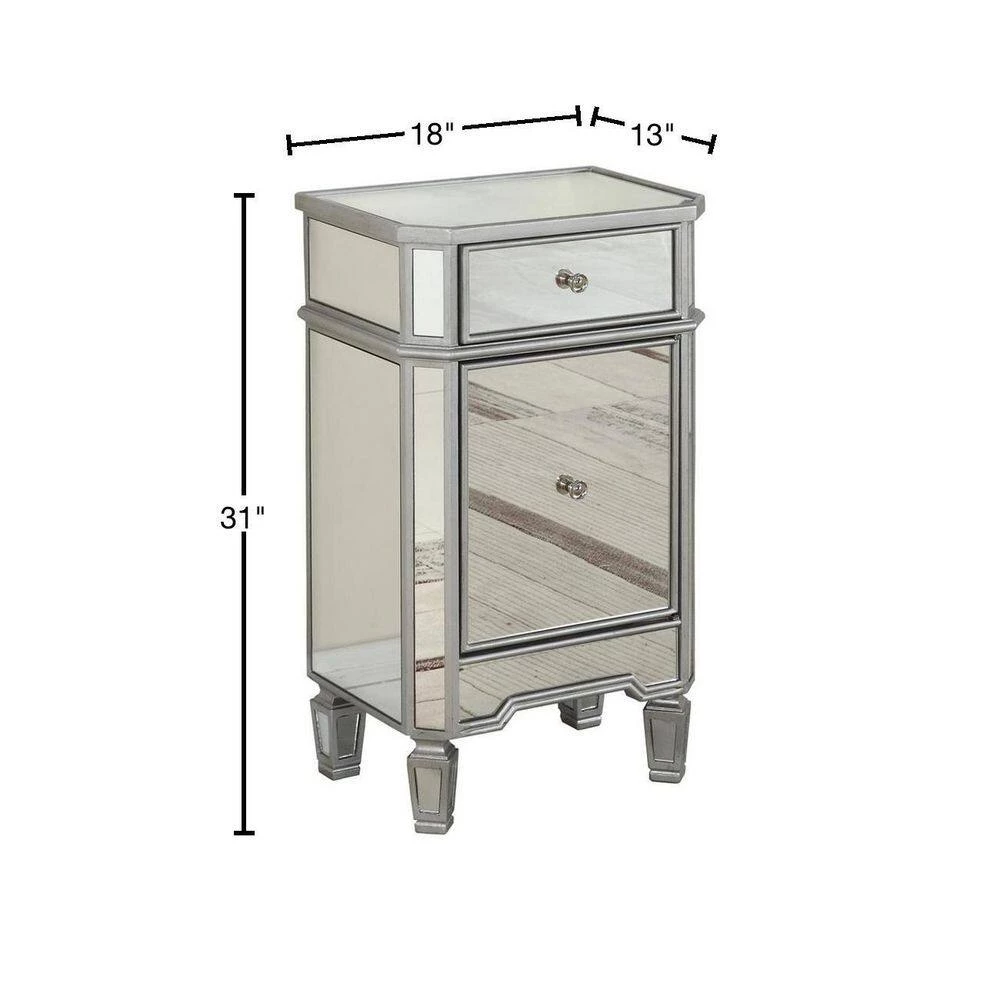 Whether this can be used as an end table for your living room, nightstand for your bedroom or a stand for your hallway. This accent stand comes with 1 drawer and 1 cabinet for storage. It is made of manufactured wood, mirrored panels, except for the back and comes with side metal rails. The mirror is finished in a clear finish and has the contemporary look.