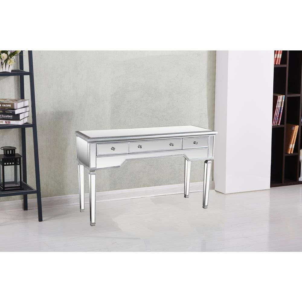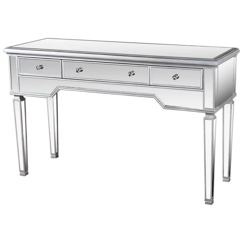 This mirrored glass console table is made of birch wood, MDF, brushed with silver color and has 3 drawers that offers sufficient storage for your keys and personal belongings. The arrow feet and mirrored finished will definitely makes this console table more special. This console table is practical for the family room, entryway, and or living room. It is made to fit into any large or small homes. All 3-Drawers open individually.