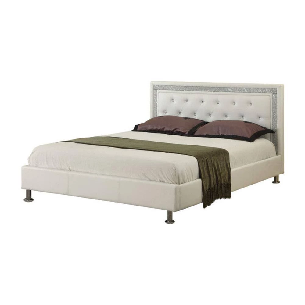 This modern queen faux leather platform bed comes with sparkling gleam crystal studs. The bed is upholstered in faux leather with metal legs and rhinestones, eliminating the need for a box spring. This bed will surely make the feeling of your bed room luxurious.