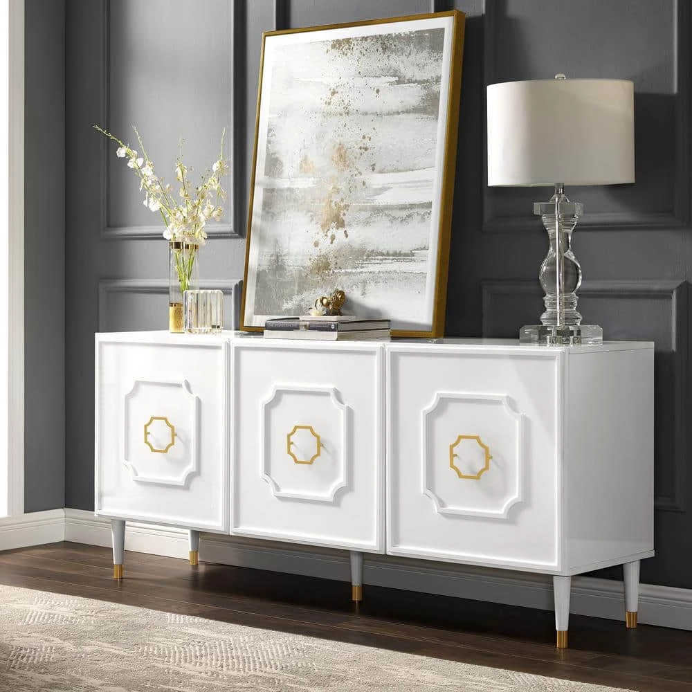 This gleaming modern lacquer finish sideboard/buffet is perfect for your home or office. It deserves to be the center of attention in your living room, dining room, kitchen or office and to stand out from the rest. This inspired elegant piece features cabinet doors with the stainless steel brushed gold plating handles and leg tips which blend functionality into any home decor. Its shelving storage is perfect for keeping items safely tucked away. You can also display items like decorative plants and photos of your family and friends. This cabinet includes adjustable shelves that can move to different heights to create flexible storage options for items of all shapes and sizes. Versatile with its contemporary clean lines this cabinet brings a unique and exceptional feel to your home.