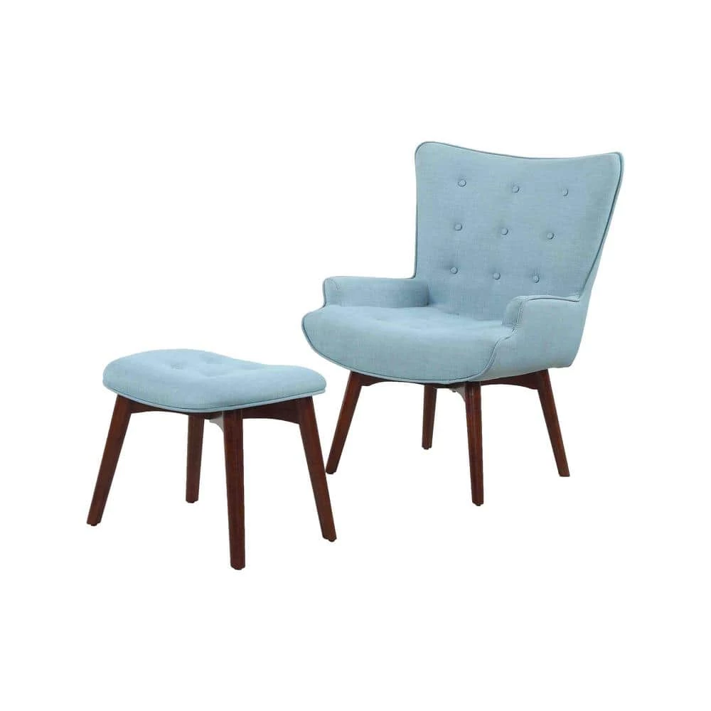 Add creativity and versatility in your living room or bedroom with this nice upholstered accent chair with ottoman. The chair is upholstered in a polyester blend fabric in an asphalt finish. The sturdy wood frame is made of manufactured hard wood in a walnut finish. The back and ottoman are also tufted with buttons to give it a special feature.