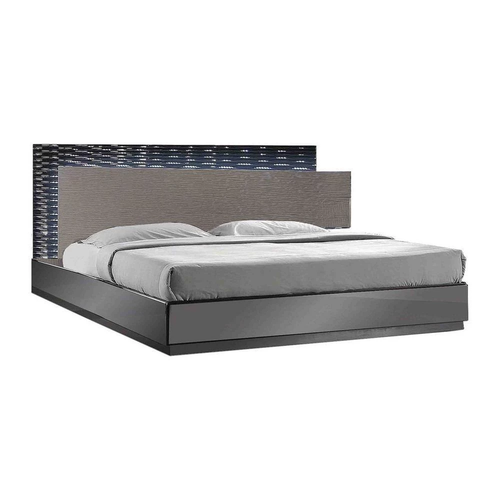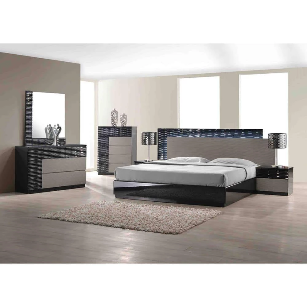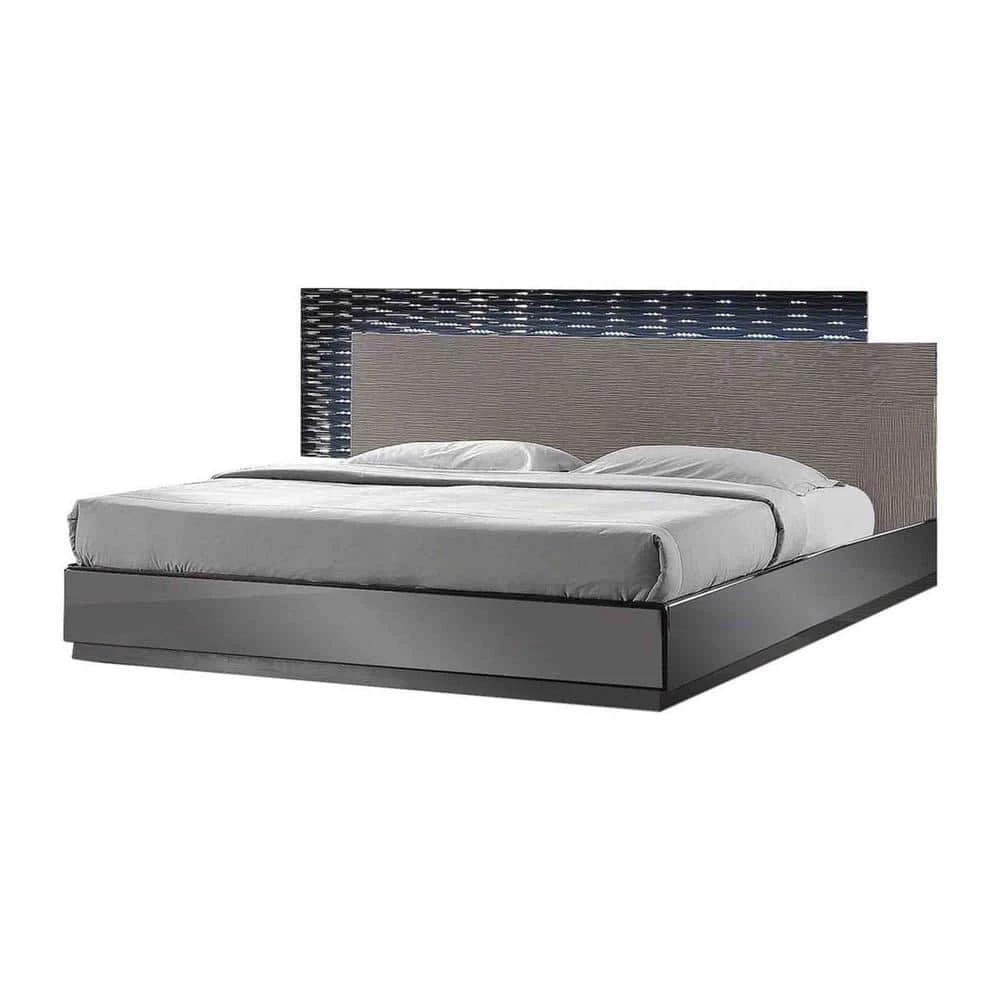 Revamp your bedroom with this platform bed. This platform bed features clean angled lines with a unique combination of high gloss black and gray surface. Fashioned with, an LED Light on the headboard to enhance this contemporary look. It is well-built, with MDF wood, coated with extra high gloss for a sleeker feel to your bedroom. Bed comes with wooden slats so there is no need for a box spring or foundation.