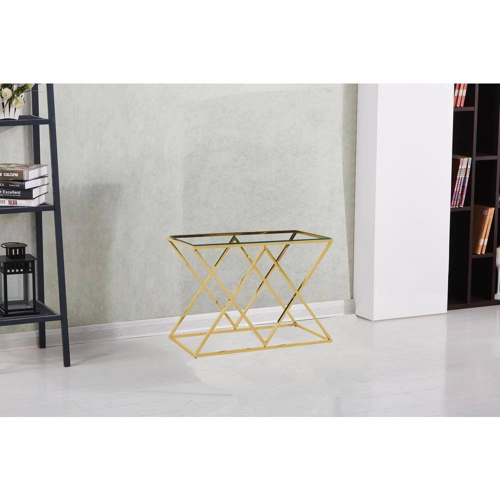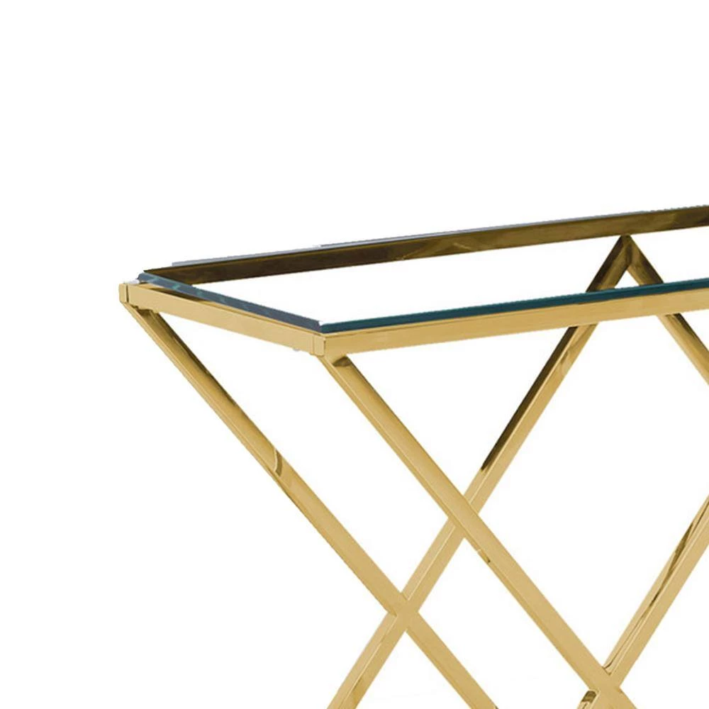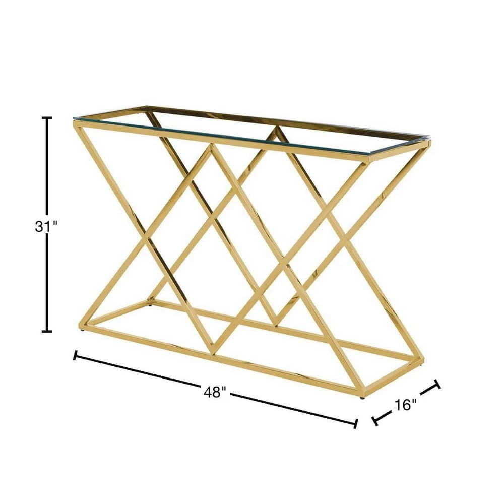 Amp up your living room or hallway with this contemporary clear glass coffee table. The glamorous angled base is made of stainless steel and the glass is in a clear finish. The glass is ½ thick and is in a rectangular shape.