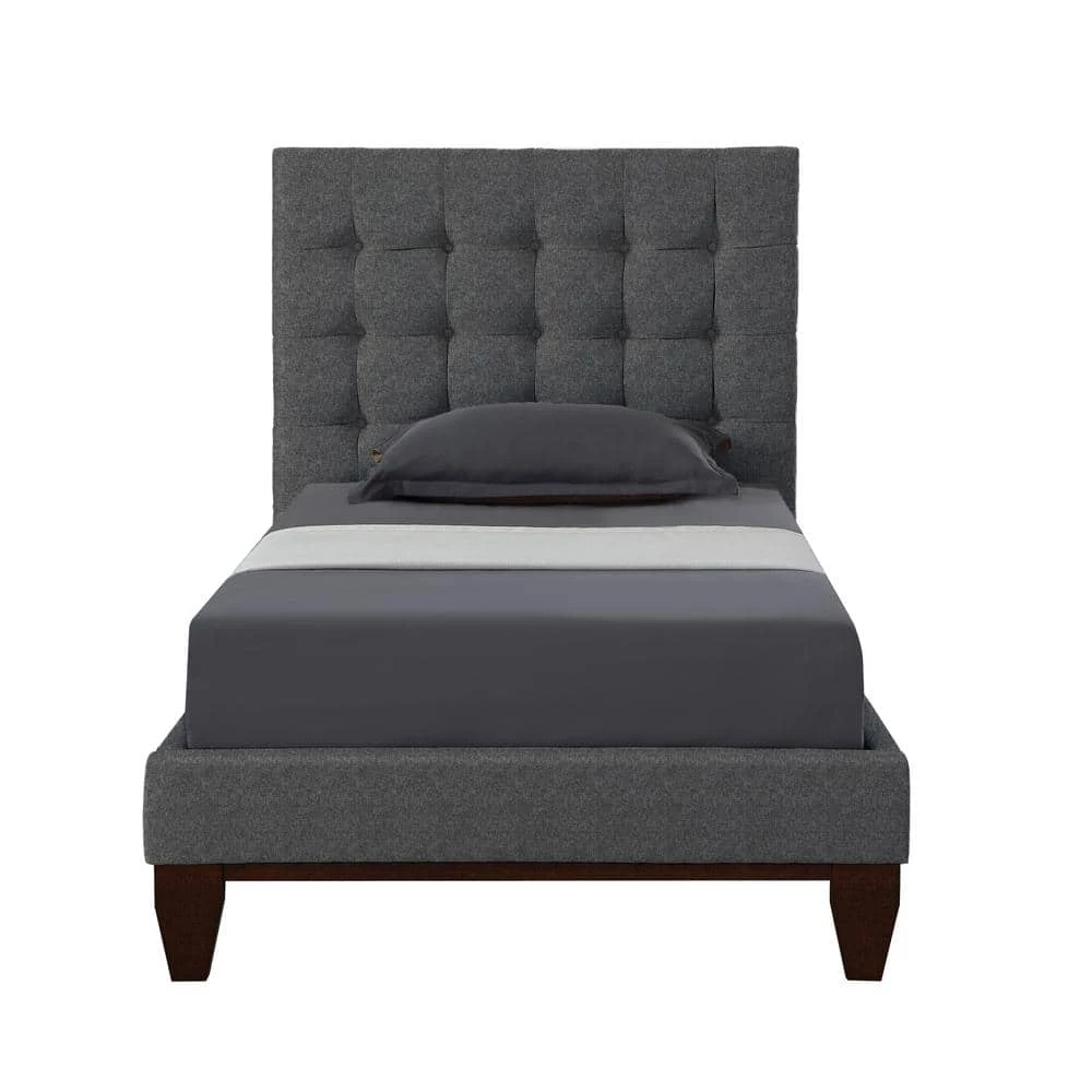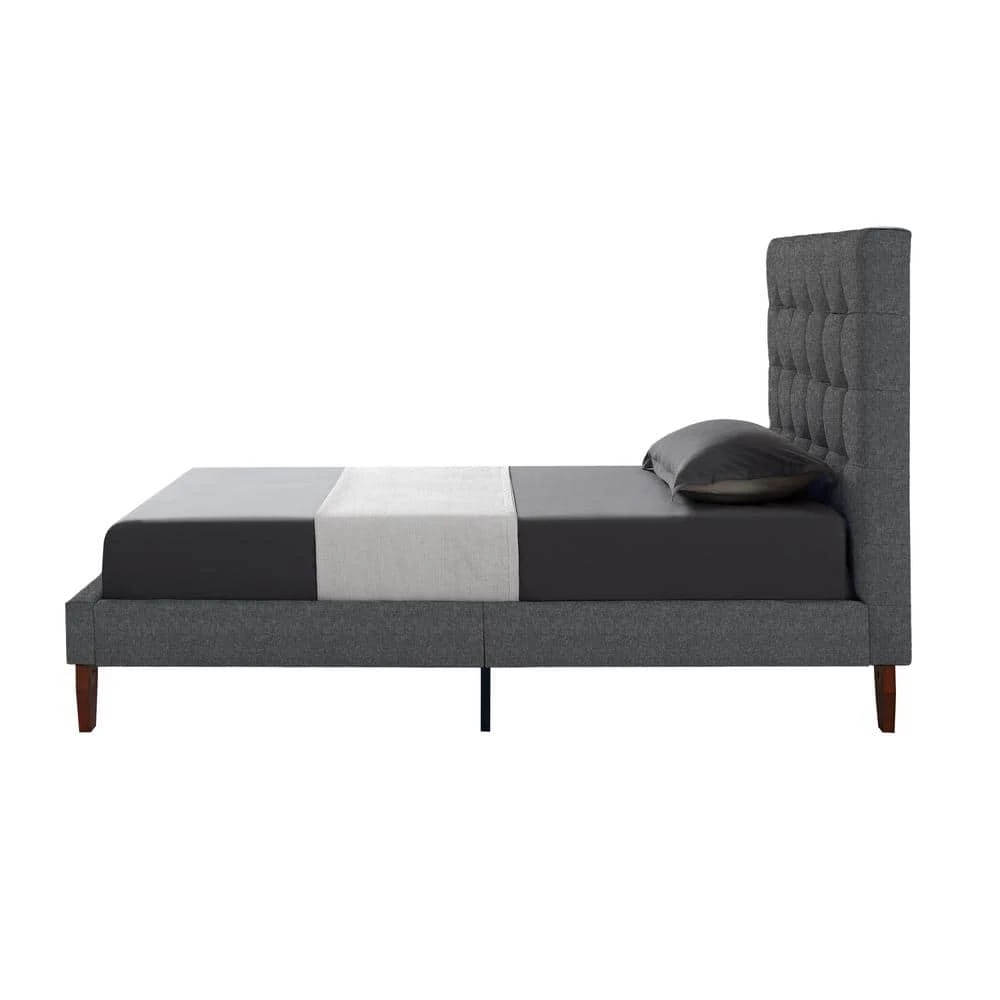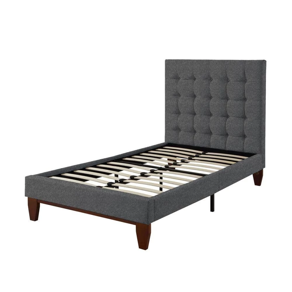 Our bed frame adds a measure of modern sophistication and elegance to your bedroom. Get the feeling of laying your head down each night in a upscale five star hotel room. This stylish bed frame features exquisite fabric, a button tufted high density foam padded headboard, and tapered solid wood legs to provide a luxurious end to your day.