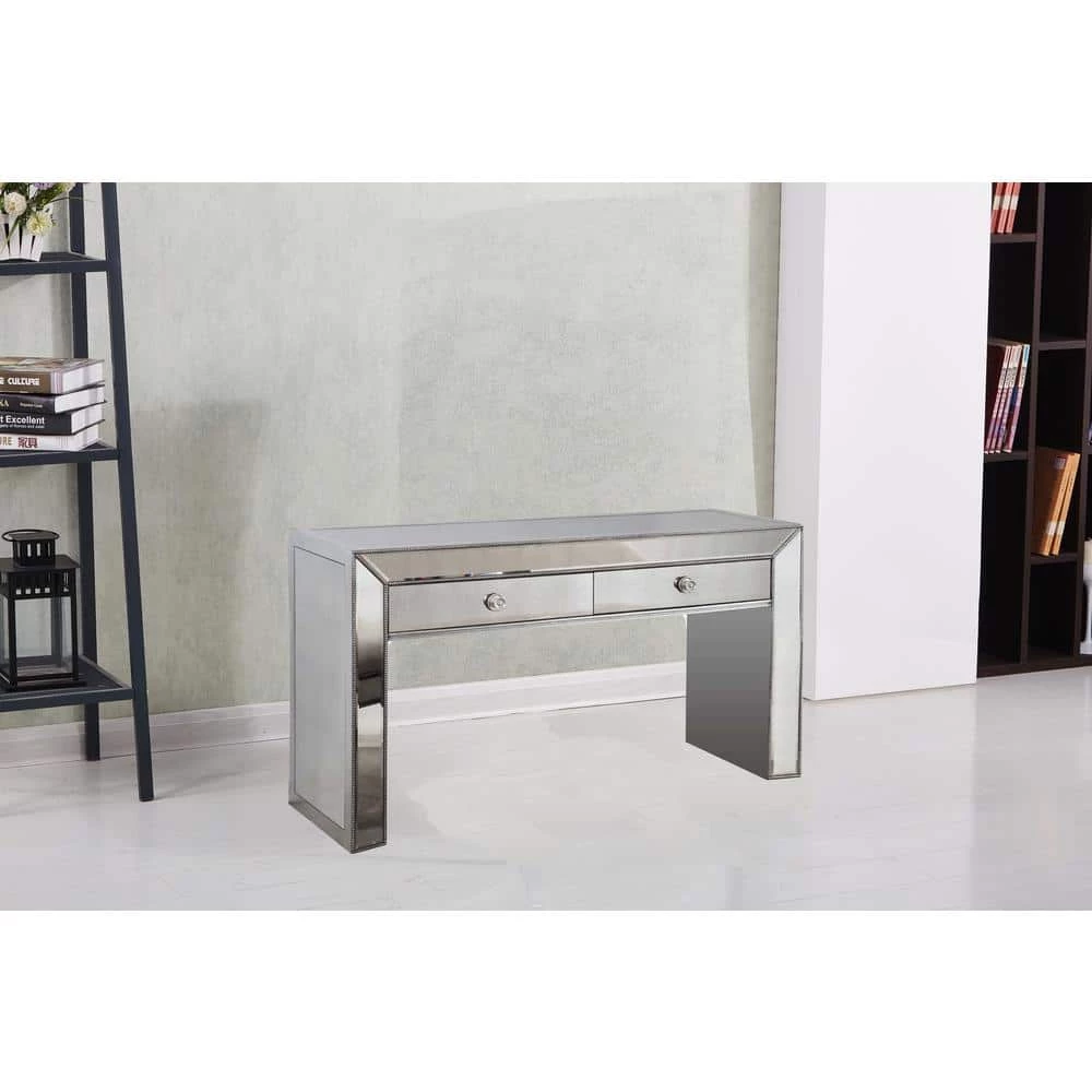 This console table will be a gorgeous addition to your living room or hallway. It features solid wood construction, mirrored inlays on top panel and front panel and metal side rails on drawers. The trimming has a natural distressed finish and all mirrored panels have an antique finish.